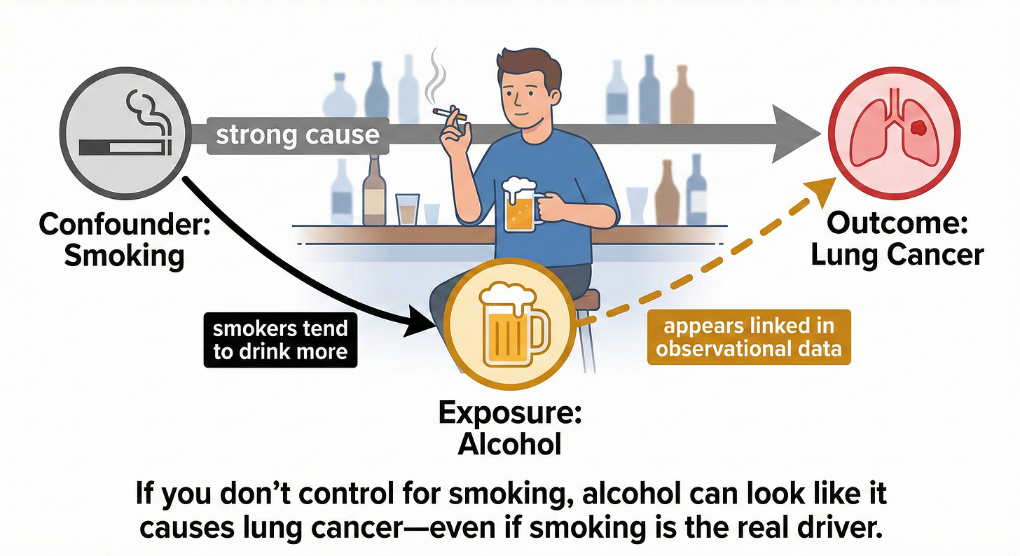 But, if the alcohol-lung cancer link shrinks or disappears after controlling for smoking, that’s the signature of confounding: alcohol was “tagging along” with smoking.
