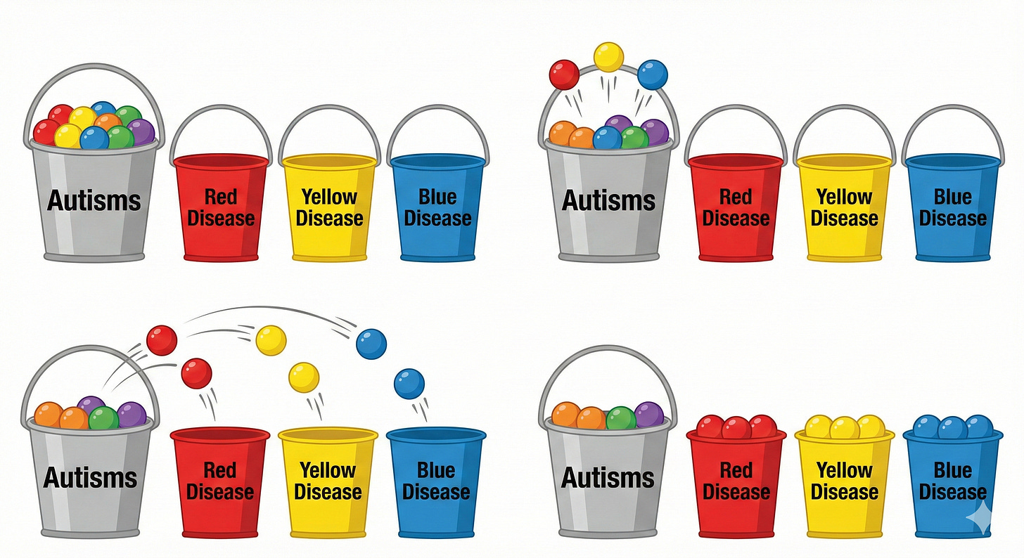 Over time, he believes, autism will be divided into smaller, clearer categories. “If you play that out, does that mean in 15 years we won’t have autism anymore? We’ll have a hundred different sub-disorders… they’ll lend themselves to very different treatments,” said Dr. Nelson. Conditions with known biological causes, like the folate-transport disorder, will move into their own buckets. What remains will be the unexplained cases: “autisms” that still defy understanding.