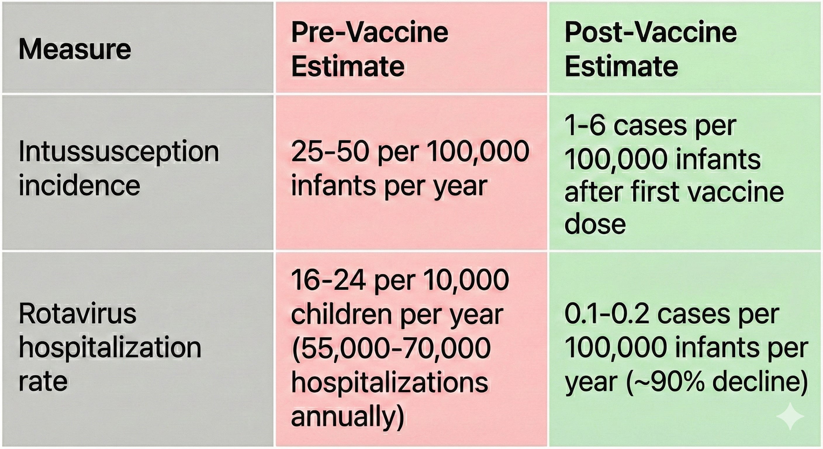 It’s a bit like the COVID vaccines and myocarditis: both the virus and the vaccine can affect the heart, but infection itself is much more likely to cause problems. In the same way, both rotavirus infection and the rotavirus vaccine can very rarely cause intussusception, but it happens far more often after infection than after vaccination. The vaccine’s risk is tiny compared with the danger of severe dehydration and hospitalization from rotavirus infection.