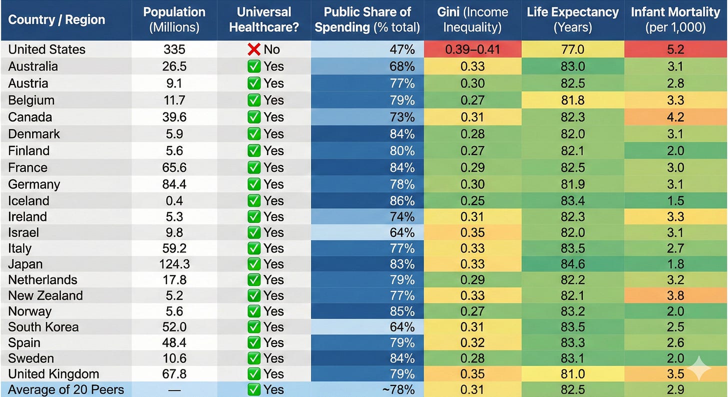 Table 2. Healthcare and socioeconomic Indicators for the U.S. and 5 countries with similar levels of income inequality, life expectancy, and infant mortality rates