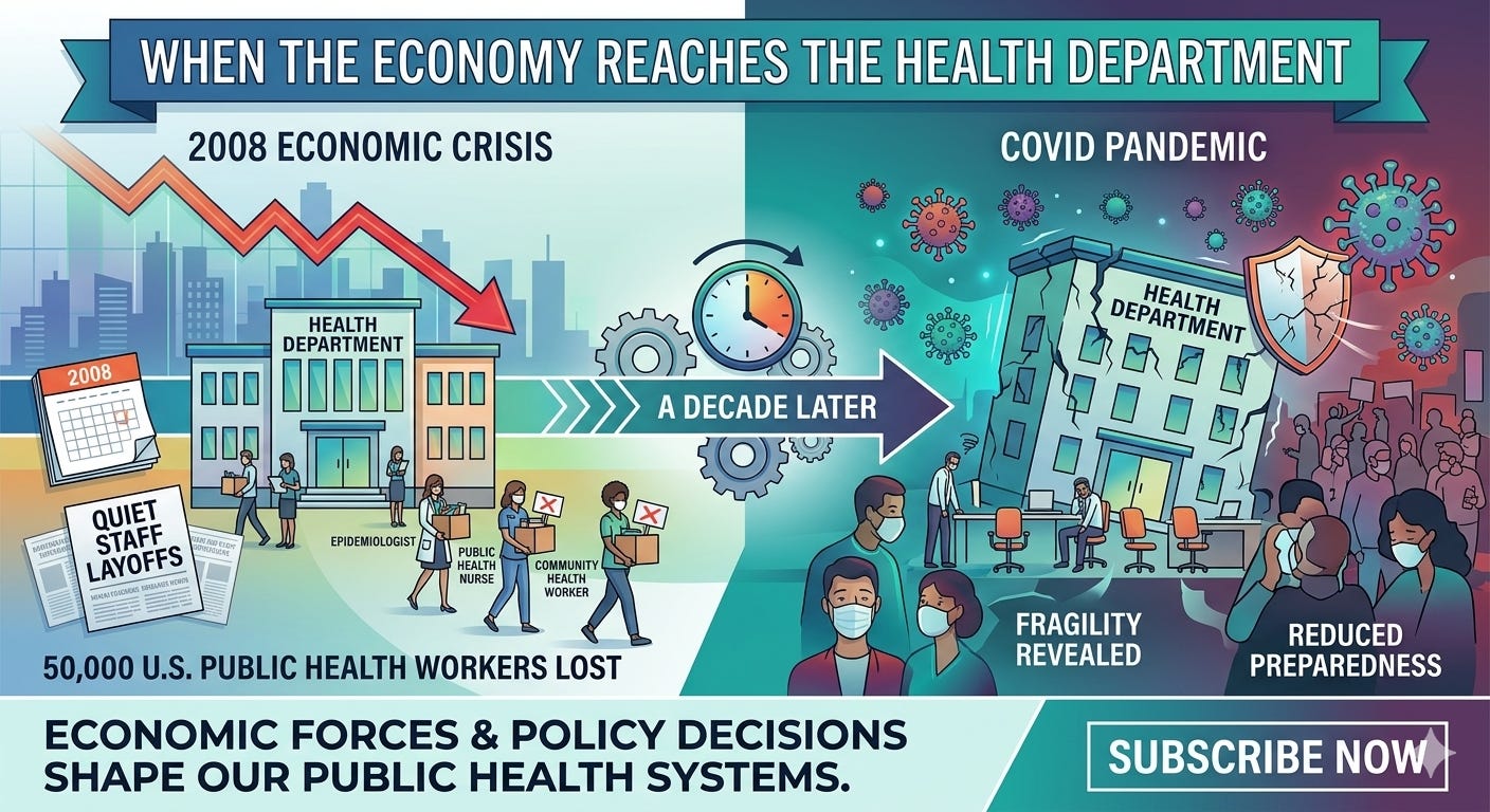 But the effects became clear a decade later. When COVID arrived, many health departments were already struggling after years of budget cuts, hiring freezes, and reduced preparedness programs.