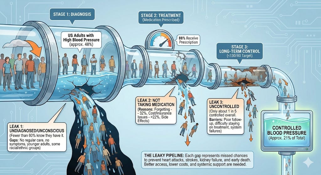 From a public health perspective, the diagnosis and treatment of blood pressure looks like a leaky pipeline. People drop out at every step, from screening to long-term control. Each gap means missed chances to prevent heart attacks, strokes, kidney failure, and early death.