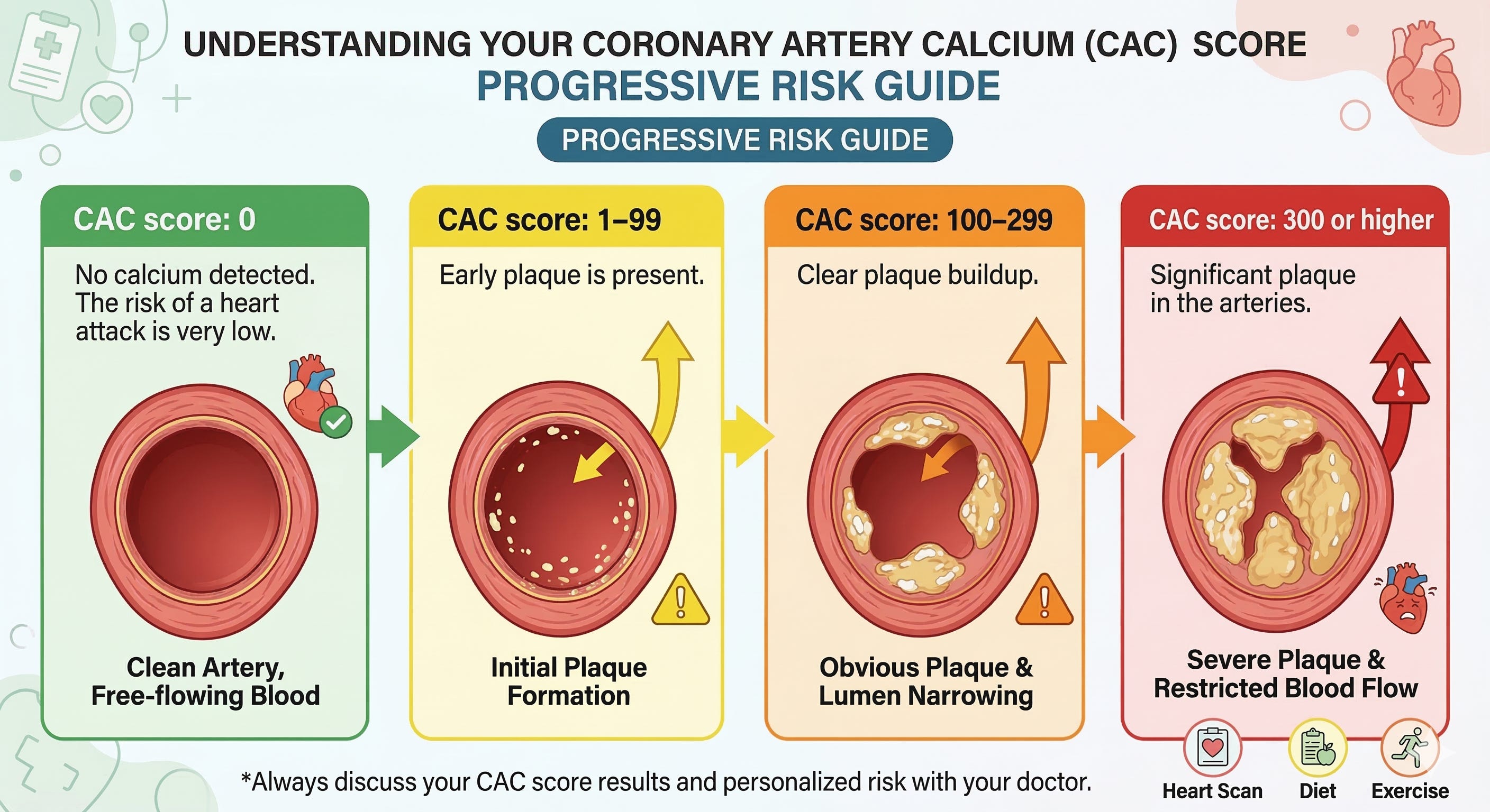 Today, doctors can detect plaque long before symptoms appear using a simple CT scan called a coronary artery calcium (CAC) scan that can detect plaque inside the arteries.