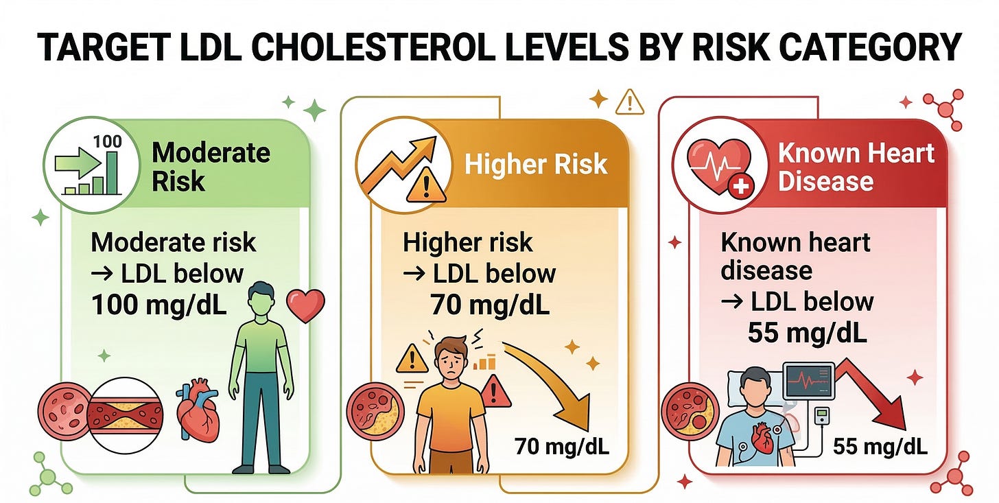 Higher risk → LDL below 70 mg/dL