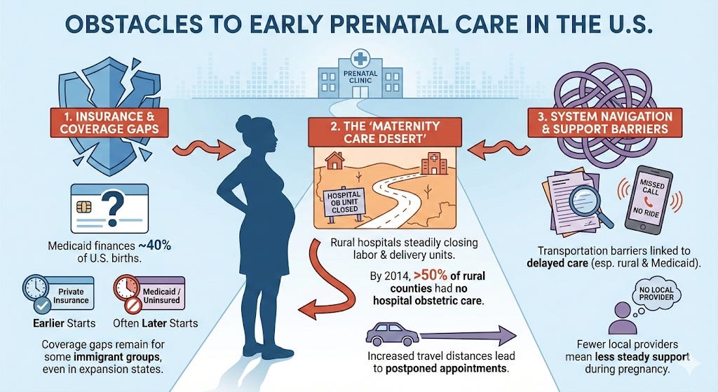 The new federal data do not point to a single cause for the decline in early prenatal care. Instead, they suggest that timing depends on several factors at once: insurance coverage, provider availability, transportation access, and support navigating the health system.