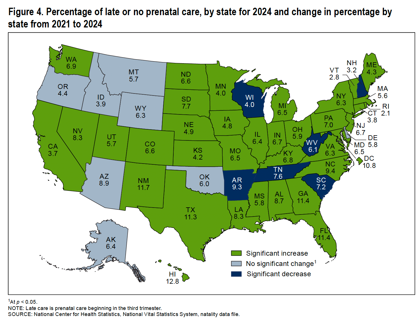 New federal data released today by the National Center for Health Statistics show that first-trimester prenatal care declined between 2021 and 2024. In 2021, 78% of mothers began care in the first trimester. By 2024, that figure had fallen to 76%. During the same period, second-trimester starts rose from 15% to 17%, and late or no care increased from 6% to 7%.