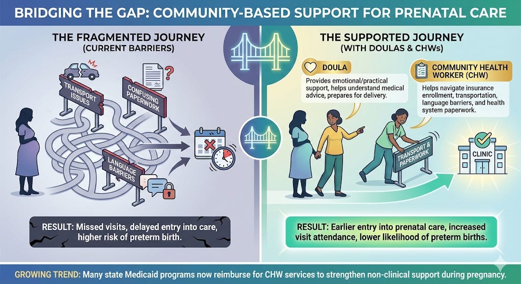 In recent years, more states have begun using Medicaid to support both doulas and community health workers. According to KFF, many state Medicaid programs now reimburse CHW services, including health education, outreach, care coordination, and help navigating the health system. States vary in how they certify providers and structure payments, but the overall trend reflects growing interest in strengthening non-clinical support during pregnancy.
